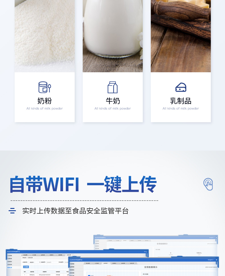 6、儀器帶有監(jiān)管平臺。檢測結(jié)果可直接無線上傳。進行數(shù)據(jù)分析處理,檢測乳制品等長短期動態(tài),達到問題預(yù)估、預(yù)警。