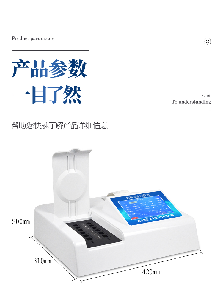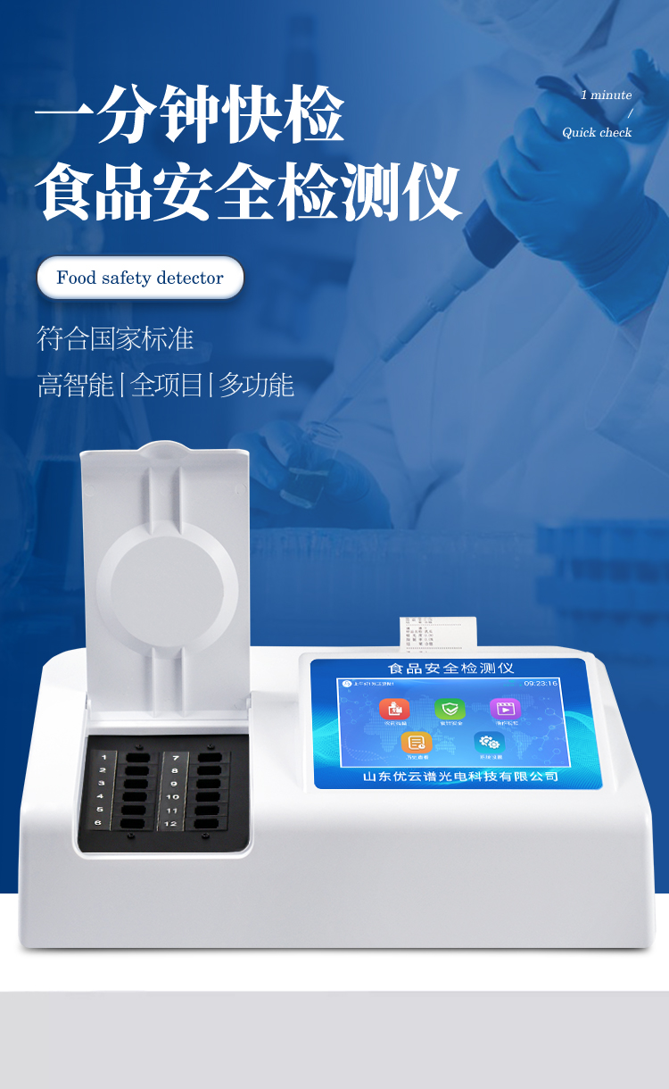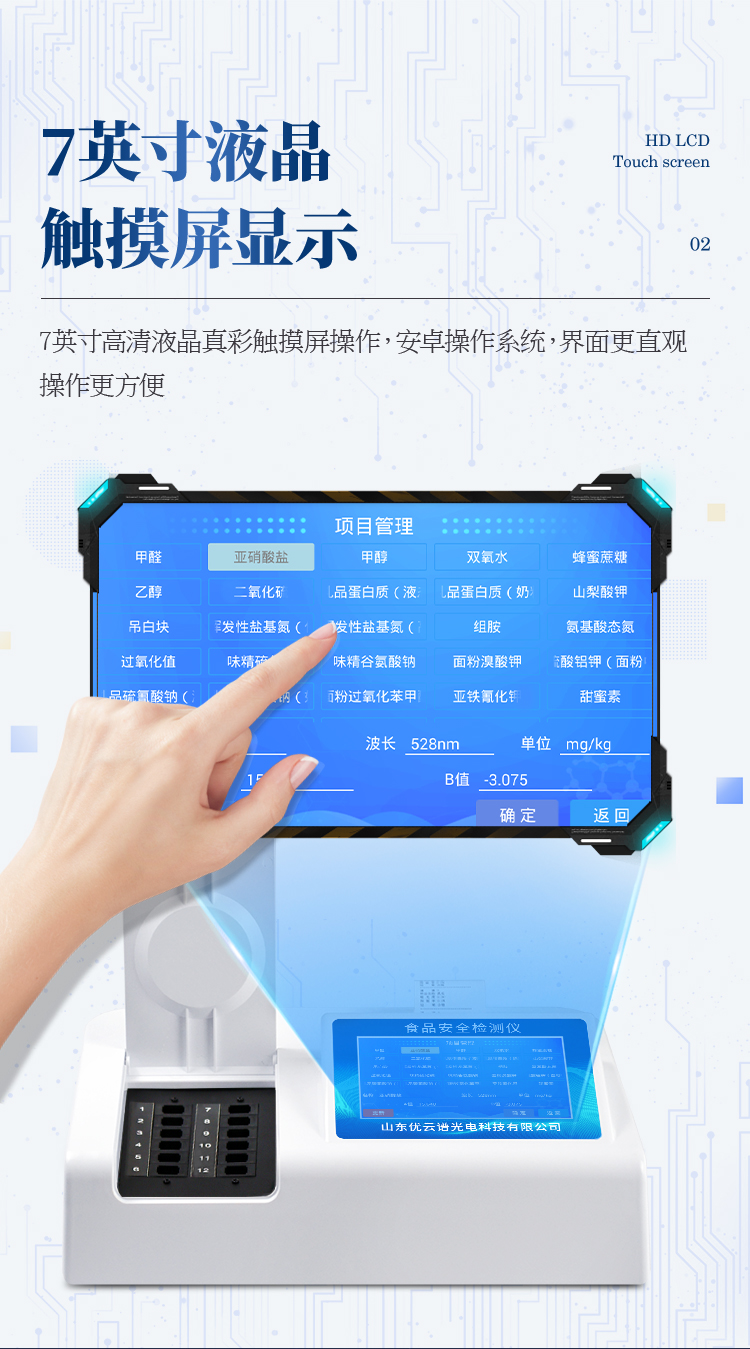 可快速檢測各類食品中的亞硝酸鹽、二氧化硫、甲醛、吊白塊、雙氧水、硼砂、農(nóng)藥殘留、乳及乳制品中蛋白質(zhì)、硝酸鹽、重金屬鉛的含量,儀器預(yù)留其他項目檢測程序和端口,根據(jù)日后需求可方便的自主增加檢測項目。