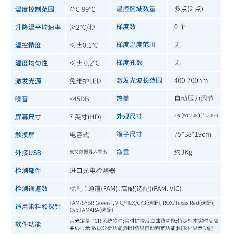 檢測(cè)通道數(shù):標(biāo)配 1通道(FAM)、高配(選配)(FAM、VIC)