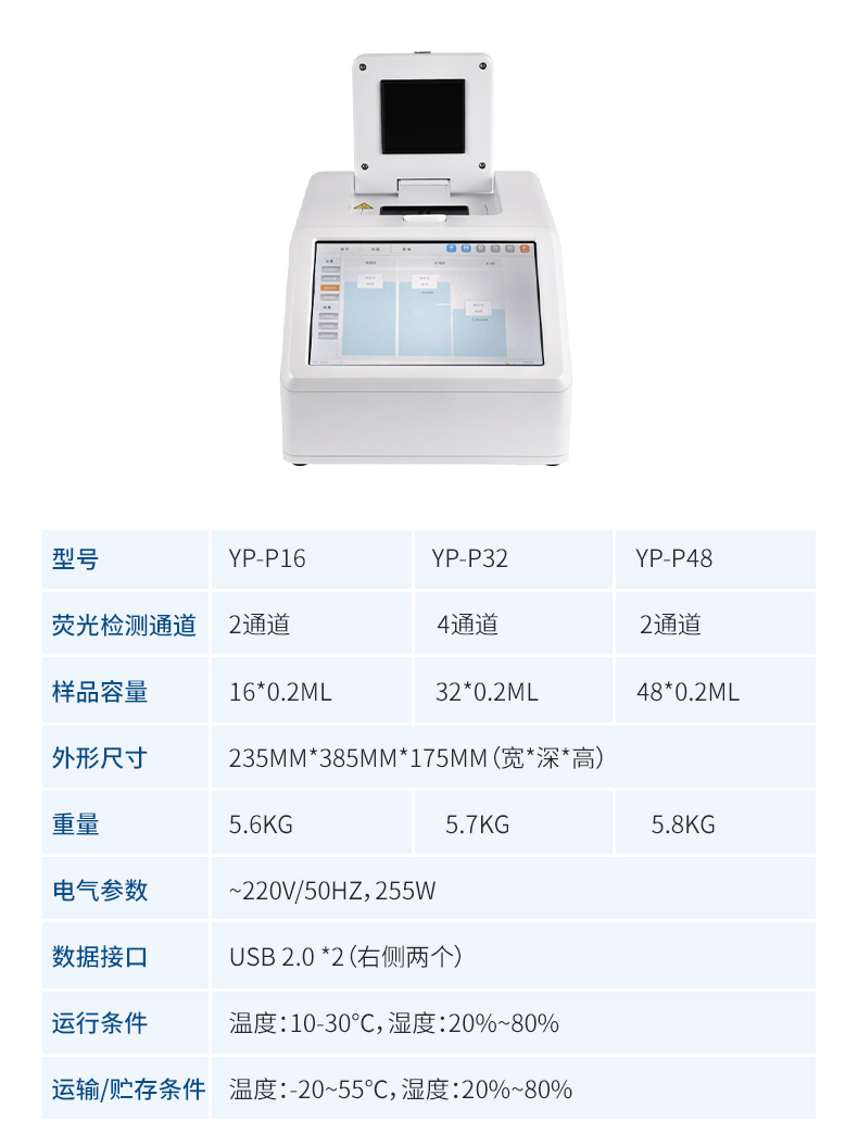 YP-P96型號(hào)實(shí)時(shí)熒光定量PCR系統(tǒng)主要用于運(yùn)行實(shí)時(shí)熒光定量PCR實(shí)驗(yàn),通過熒光激發(fā)和采集的方式,對(duì)實(shí)驗(yàn)過程進(jìn)行實(shí)時(shí)監(jiān)控,將實(shí)驗(yàn)過程數(shù)據(jù)繪制成熒光曲線,實(shí)時(shí)呈現(xiàn)于儀器顯示界面,并對(duì)實(shí)驗(yàn)數(shù)據(jù)進(jìn)行擬合和分析,最后可生成PDF格式的實(shí)驗(yàn)報(bào)告。