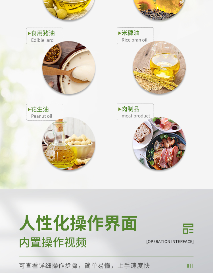 酸價過氧化值測定儀為集成化油品快速檢測分析設(shè)備,能夠快速檢測食用植物油、食用豬油、花生油、葵花油、米糠油、食品、肉制品中的酸價、過氧化值含量;通過檢測可確定植物油是否符合國家標(biāo)準(zhǔn)或是否為劣質(zhì)油、地溝油等。儀器預(yù)留其他項目檢測程序和端口,根據(jù)日后需求可方便的自主增加檢測項目。日后可升級為檢測水產(chǎn)品、面制品的綜合類型儀器。