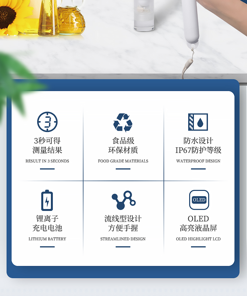 ■快速測量 3秒鐘能得到測量結(jié)果,并有不同區(qū)間品質(zhì)的閃爍提示。