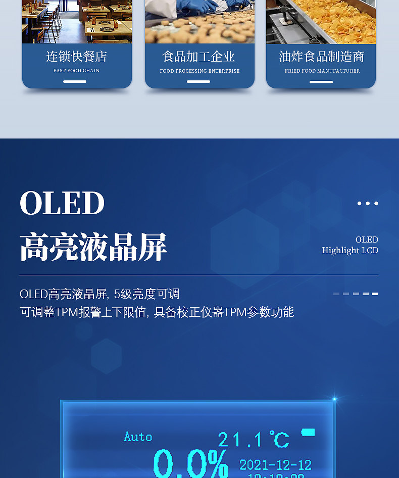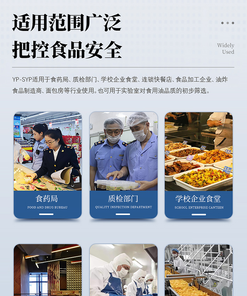 YP-SYP工業(yè)版特別適合食藥局、質(zhì)檢部門、學校企業(yè)食堂、連鎖快餐店、食品加工企業(yè)、油炸食品制造商、面包房等行業(yè)使用,也可以用戶實驗室對食用油品質(zhì)的初步篩選。能為您達到檢驗油品品質(zhì)、節(jié)省食用油、保證產(chǎn)品的質(zhì)量、保證食品安全的目的。