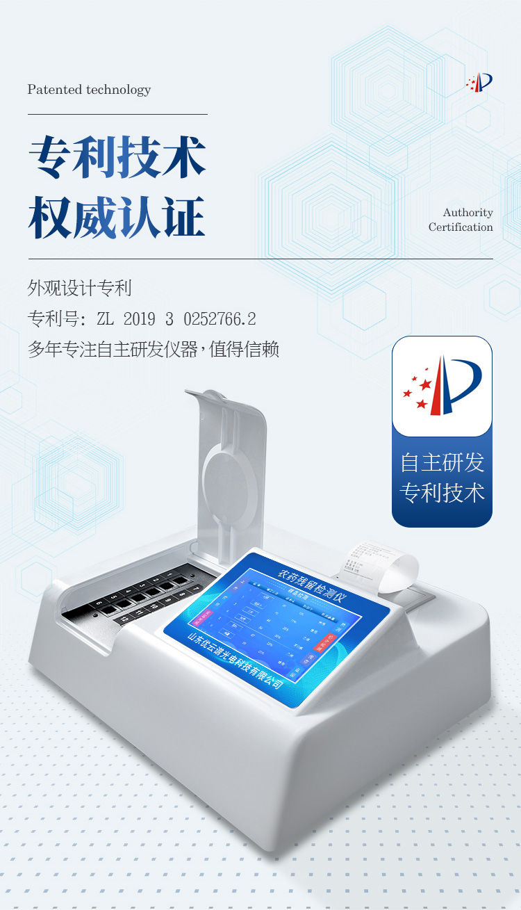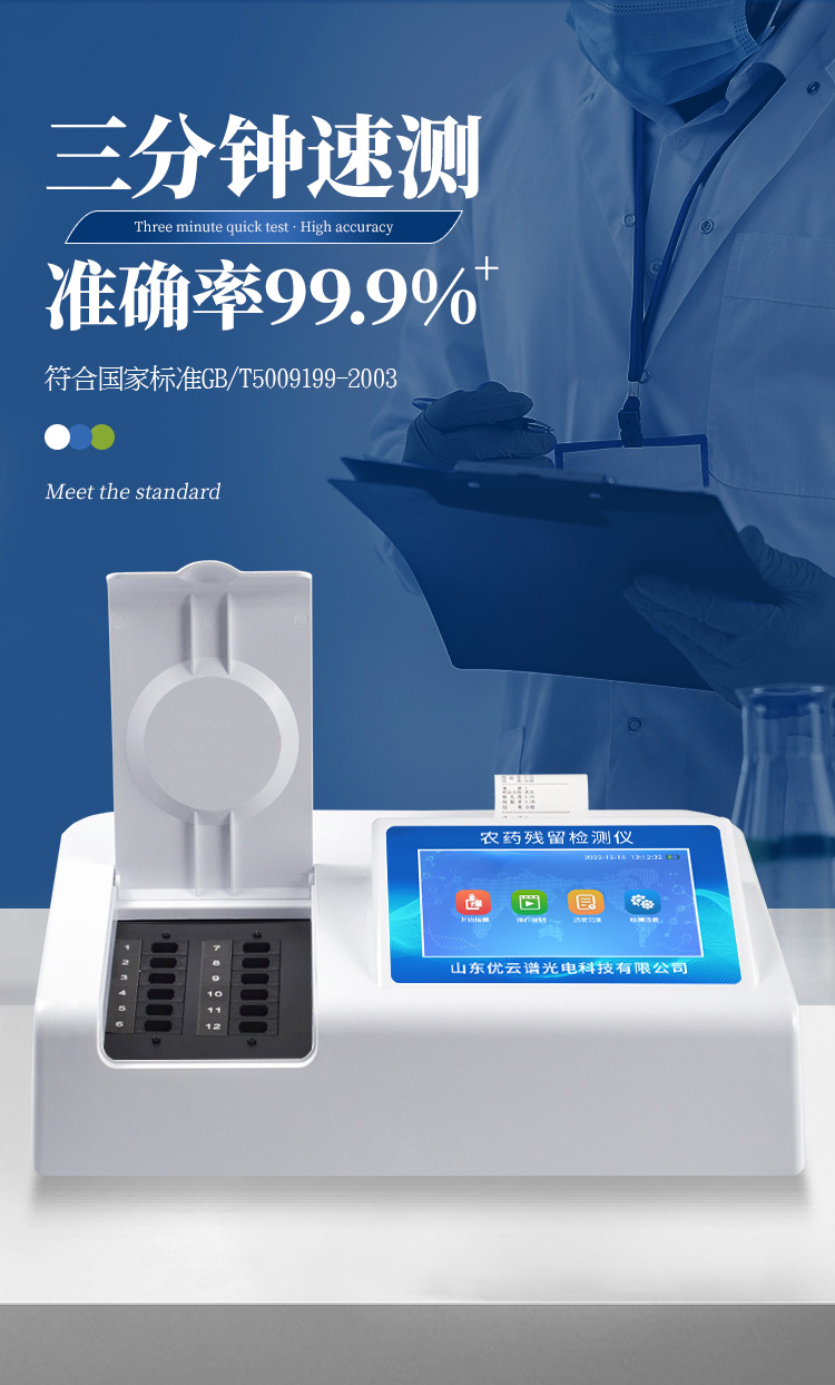 檢測(cè)標(biāo)準(zhǔn):依據(jù)國(guó)家標(biāo)準(zhǔn)方法(GB/T5009.199-2003)以及世界衛(wèi)生組織WHO、世界糧農(nóng)組織FAO殘留農(nóng)藥檢測(cè)標(biāo)準(zhǔn)、世界環(huán)境保護(hù)局EPA參照攝入量等要求來設(shè)計(jì)。采用酶抑制率比色法對(duì)水果、蔬菜等農(nóng)林產(chǎn)品中有機(jī)磷和氨基甲酸酯類農(nóng)藥含量進(jìn)行快速準(zhǔn)確的檢測(cè)。